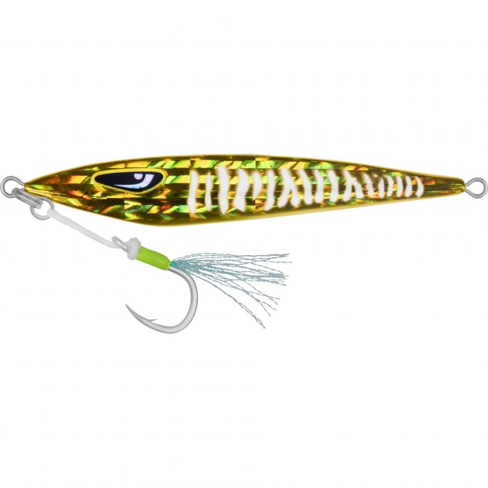 The unique shape and original design of the Ridgeback jig creates an exciting new jig action. It can be worked as a slow pitch jig with a flick of the rod tip or worked fast as a high-speed jig. The unique angled head design creates an erratic sideways darting movement at the top of each lift of the rod, just give the rod a little flick at the top, and the ridgeback darts sideways and then flutters a little before falling again. When used slow it will flutter before starting to sink quickly, making it ideal for slow pitch jigging applications. Work it fast or slow and it will shoot off to the side giving an erratic action both pelagic and bottom feeding fish cannot resist.