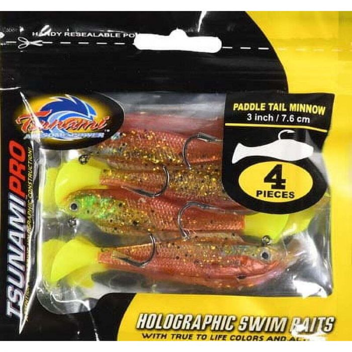 Great for saltwater fishing, the Tsunami Paddle Tail Minnows 4-Pack feature holographic color, lifelike 3-D eyes and natural swimming action that attract fish.